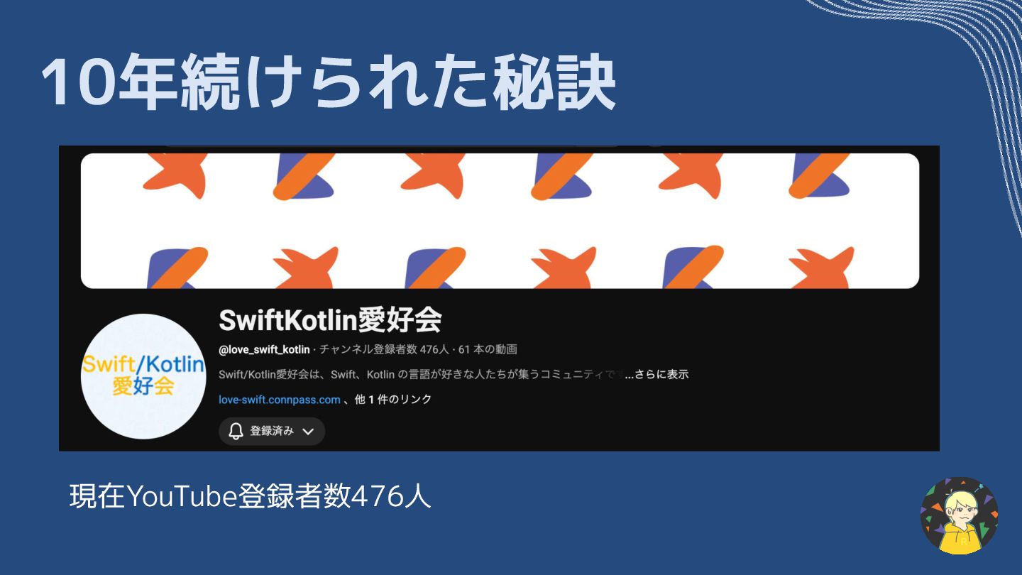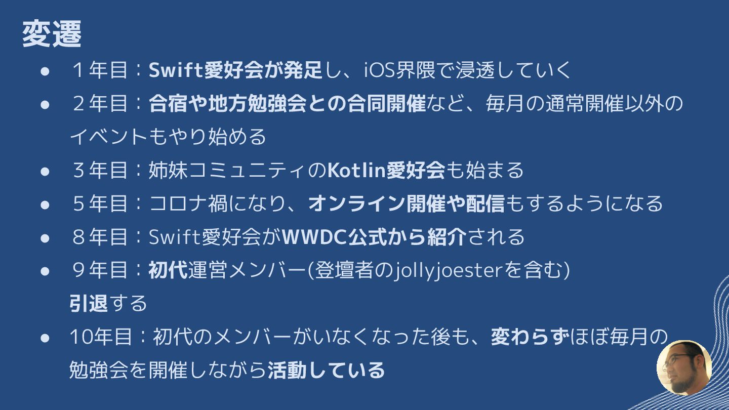 • 8年目:Swift愛好会がWWDC公式から紹介される • 9年目:初代運営メンバー(登壇者のjollyjoesterを含む)が運営から 引退する • 10年目:初代のメンバーがいなくなった後も、変わらずほぼ毎月の 勉強会を開催しながら活動している