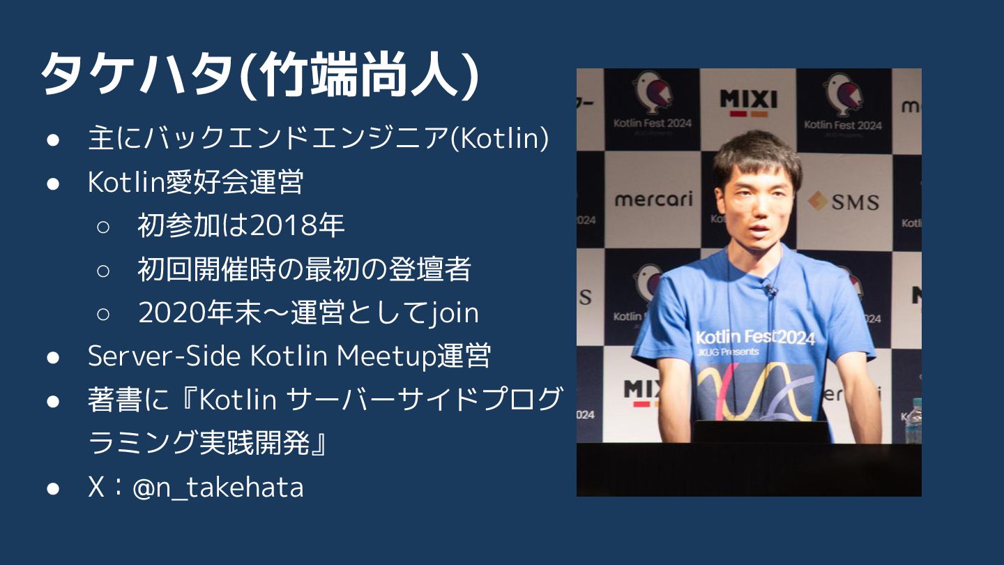 • Server-Side Kotlin Meetup運営 • 著書に『Kotlin サーバーサイドプログ ラミング実践開発』 • X:@n_takehata タケハタ(竹端尚人)
