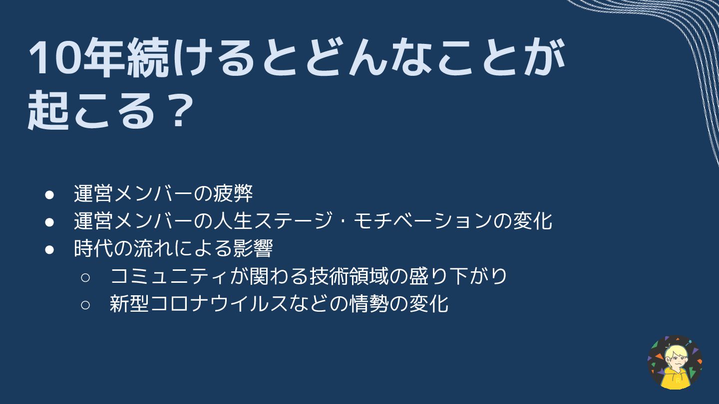 10年続けるとどんなことが 起こる? • 運営メンバーの疲弊 • 運営メンバーの人生ステージ・モチベーションの変化 • 時代の流れによる影響 ◦ コミュニティが関わる技術領域の盛り下がり