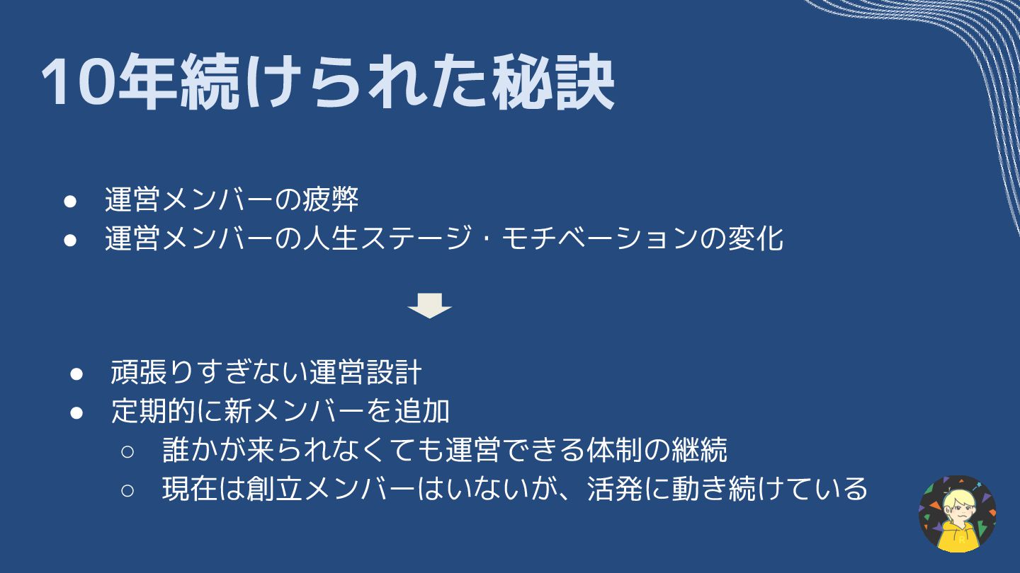 10年続けられた秘訣 • 運営メンバーの疲弊 • 運営メンバーの人生ステージ・モチベーションの変化 • 頑張りすぎない運営設計 • 定期的に新メンバーを追加 ◦