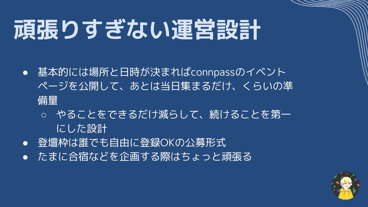 頑張りすぎない運営設計 • 基本的には場所と日時が決まればconnpassのイベント ページを公開して、あとは当日集まるだけ、くらいの準 備量 ◦ やることをできるだけ減らして、続けることを第一 にした設計 • 登壇枠は誰でも自由に登録OKの公募形式