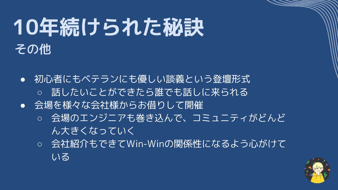 10年続けられた秘訣 • 時代の流れによる影響 ◦ コミュニティが関わる技術領域の盛り下がり ◦ 新型コロナウイルスなどの情勢の変化 • ありがたいことに技術領域が盛り上がり続けている •