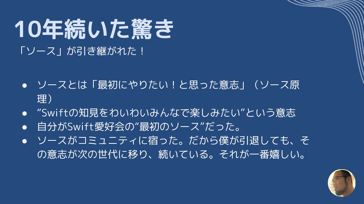 • ソースとは「最初にやりたい!と思った意志」(ソース原 理) • “Swiftの知見をわいわいみんなで楽しみたい”という意志 • 自分がSwift愛好会の“最初のソース”だった。 • ソースがコミュニティに宿った。だから僕が引退しても、そ の意志が次の世代に移り、続いている。それが一番嬉しい。
