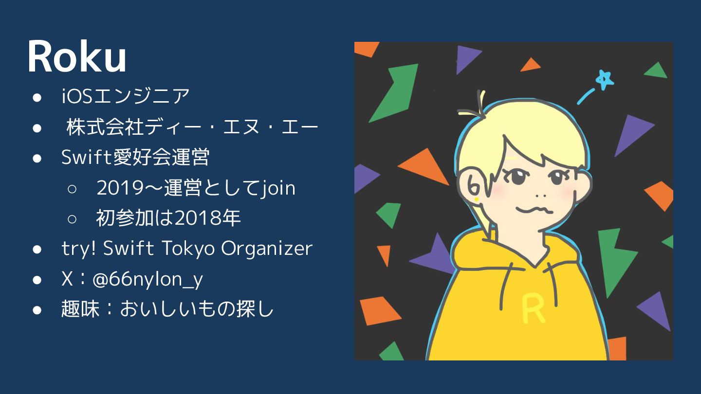 • try! Swift Tokyo Organizer • X:@66nylon_y • 趣味:おいしいもの探し Roku