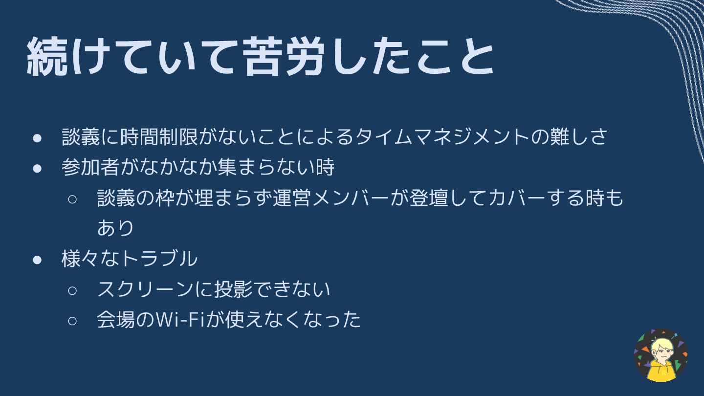 続けていて苦労したこと • 談義に時間制限がないことによるタイムマネジメントの難しさ • 参加者がなかなか集まらない時 ◦ 談義の枠が埋まらず運営メンバーが登壇してカバーする時も あり • 様々なトラブル