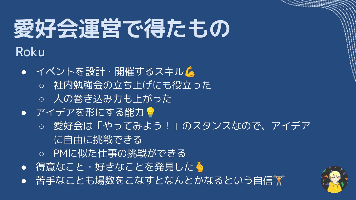 に自由に挑戦できる ◦ PMに似た仕事の挑戦ができる • 得意なこと・好きなことを発見した🫰 • 苦手なことも場数をこなすとなんとかなるという自信 愛好会運営で得たもの Roku