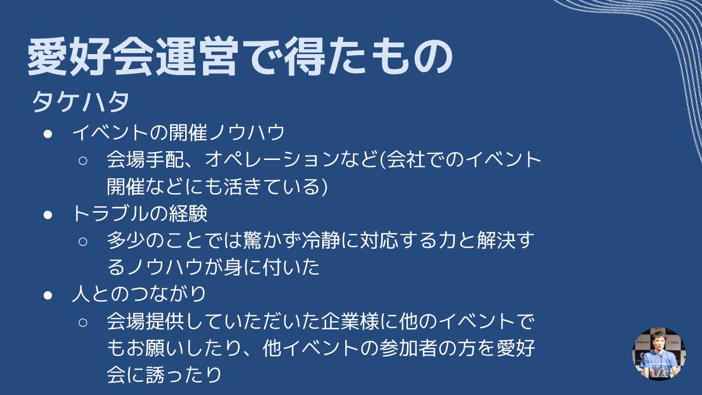 • 人とのつながり ◦ 会場提供していただいた企業様に他のイベントで もお願いしたり、他イベントの参加者の方を愛好 会に誘ったり 愛好会運営で得たもの タケハタ