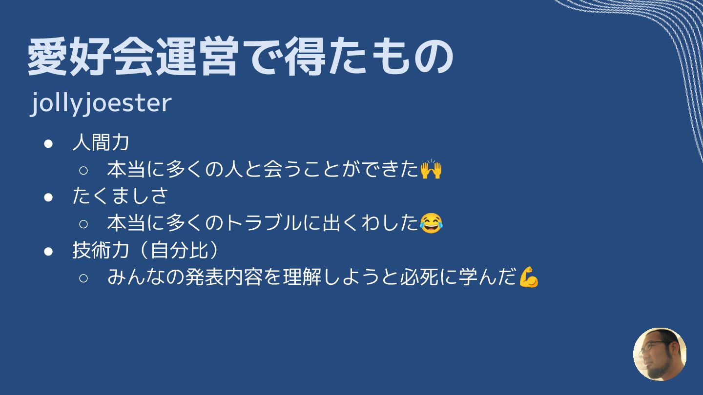 ◦ みんなの発表内容を理解しようと必死に学んだ💪 愛好会運営で得たもの jollyjoester