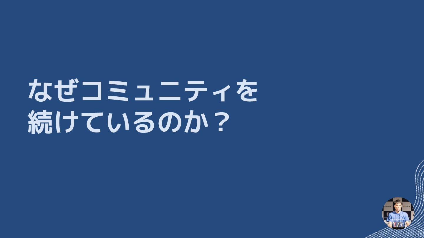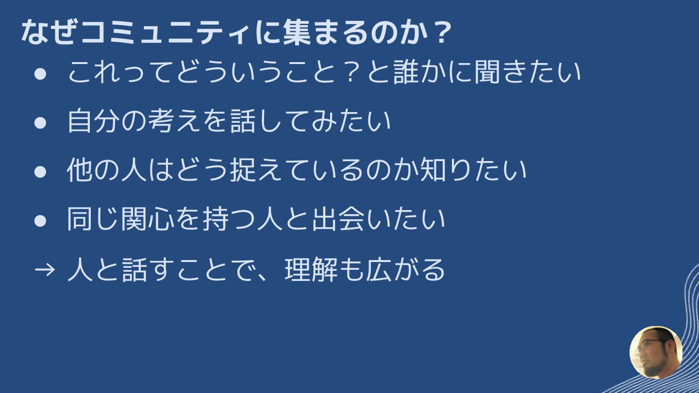 なぜコミュニティに集まるのか? • これってどういうこと?と誰かに聞きたい • 自分の考えを話してみたい • 他の人はどう捉えているのか知りたい • 同じ関心を持つ人と出会いたい →