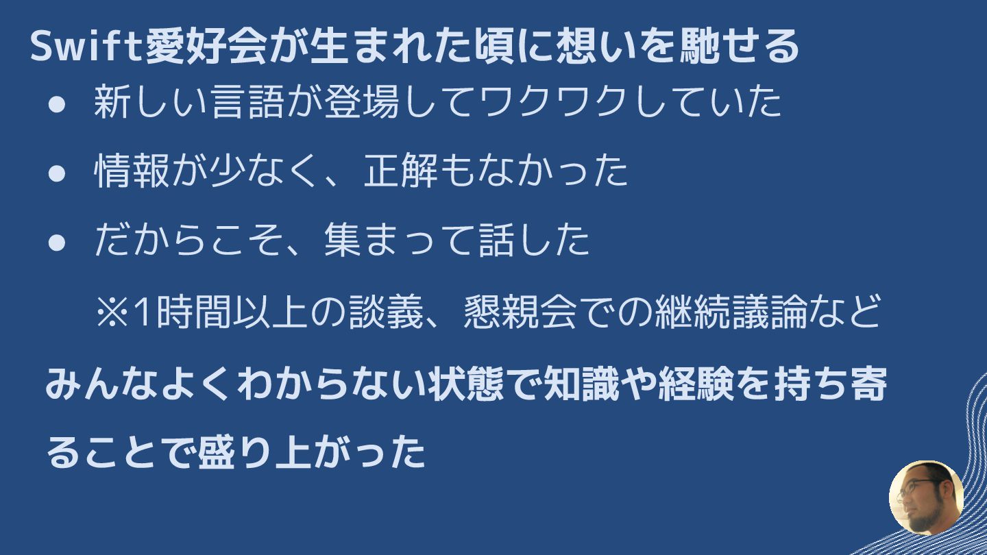 Swift愛好会が生まれた頃に想いを馳せる • 新しい言語が登場してワクワクしていた • 情報が少なく、正解もなかった • だからこそ、集まって話した ※1時間以上の談義、懇親会での継続議論など みんなよくわからない状態で知識や経験を持ち寄 ることで盛り上がった