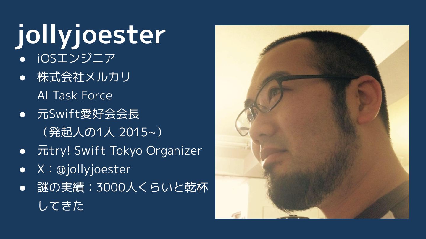 2015~) • 元try! Swift Tokyo Organizer • X:@jollyjoester • 謎の実績:3000人くらいと乾杯 してきた jollyjoester
