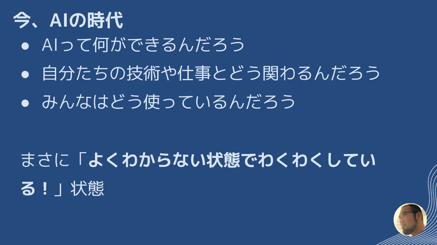 今、AIの時代 • AIって何ができるんだろう • 自分たちの技術や仕事とどう関わるんだろう • みんなはどう使っているんだろう まさに「よくわからない状態でわくわくしてい る!」状態
