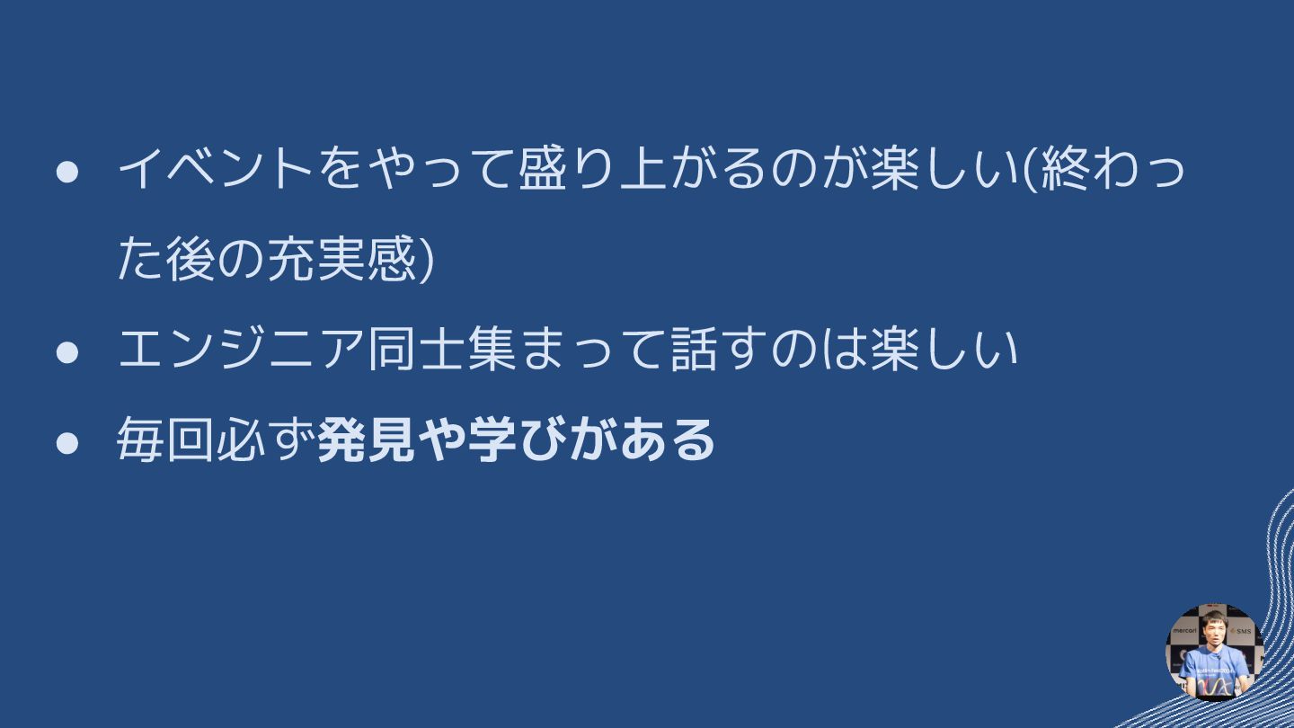 • イベントをやって盛り上がるのが楽しい(終わっ た後の充実感) • エンジニア同士集まって話すのは楽しい • 毎回必ず発見や学びがある