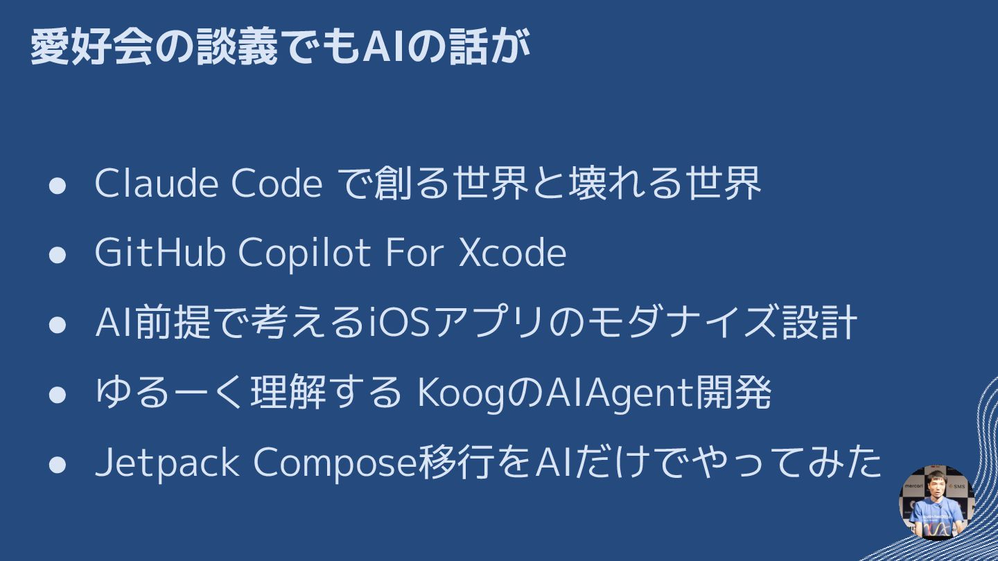 • AI前提で考えるiOSアプリのモダナイズ設計 • ゆるーく理解する KoogのAIAgent開発 • Jetpack Compose移行をAIだけでやってみた