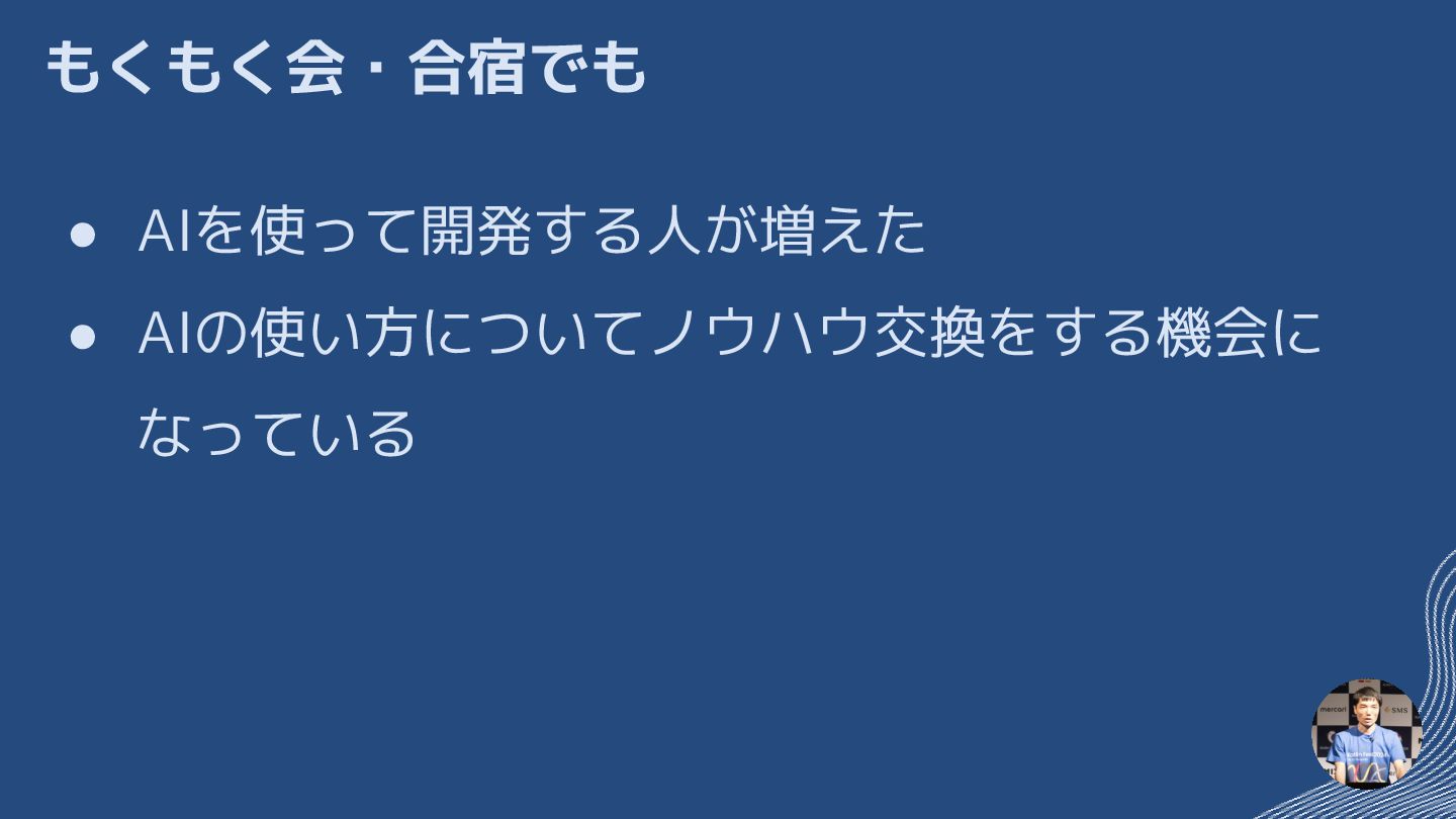 もくもく会・合宿でも • AIを使って開発する人が増えた • AIの使い方についてノウハウ交換をする機会に なっている