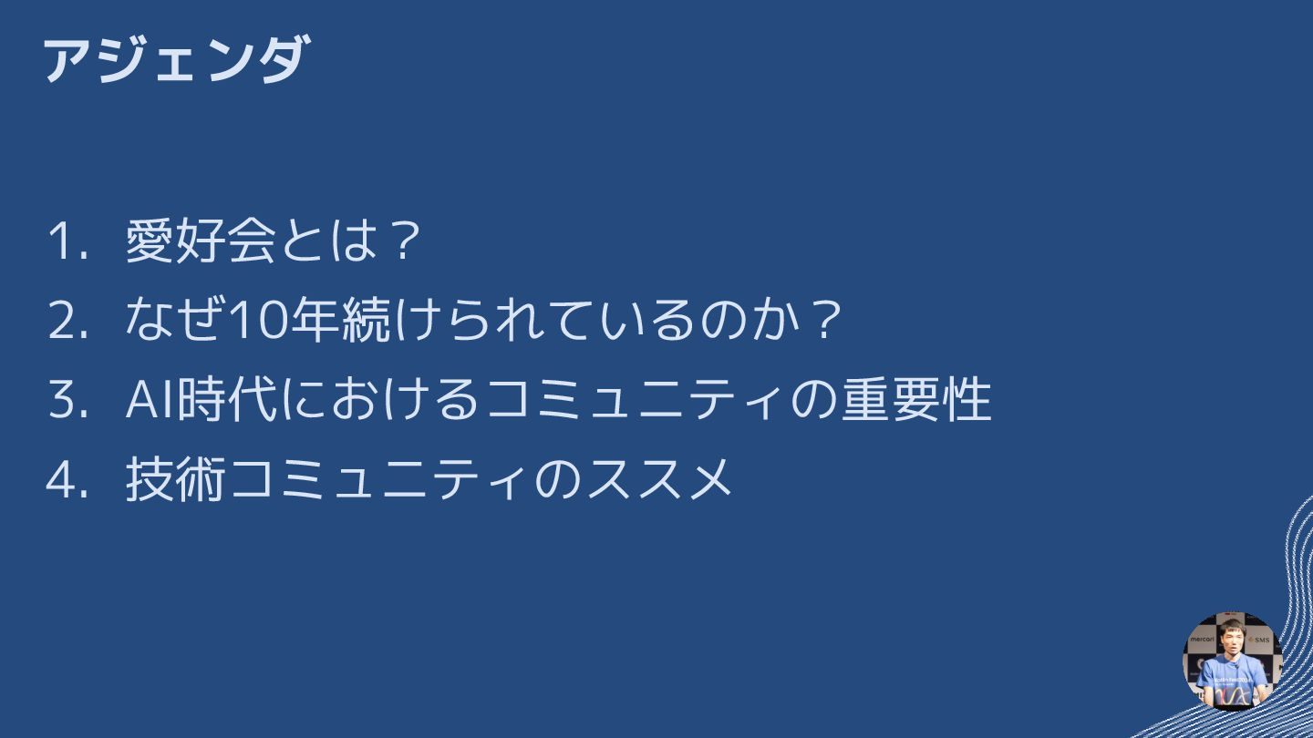 アジェンダ 1. 愛好会とは? 2. なぜ10年続けられているのか? 3. AI時代におけるコミュニティの重要性 4. 技術コミュニティのススメ