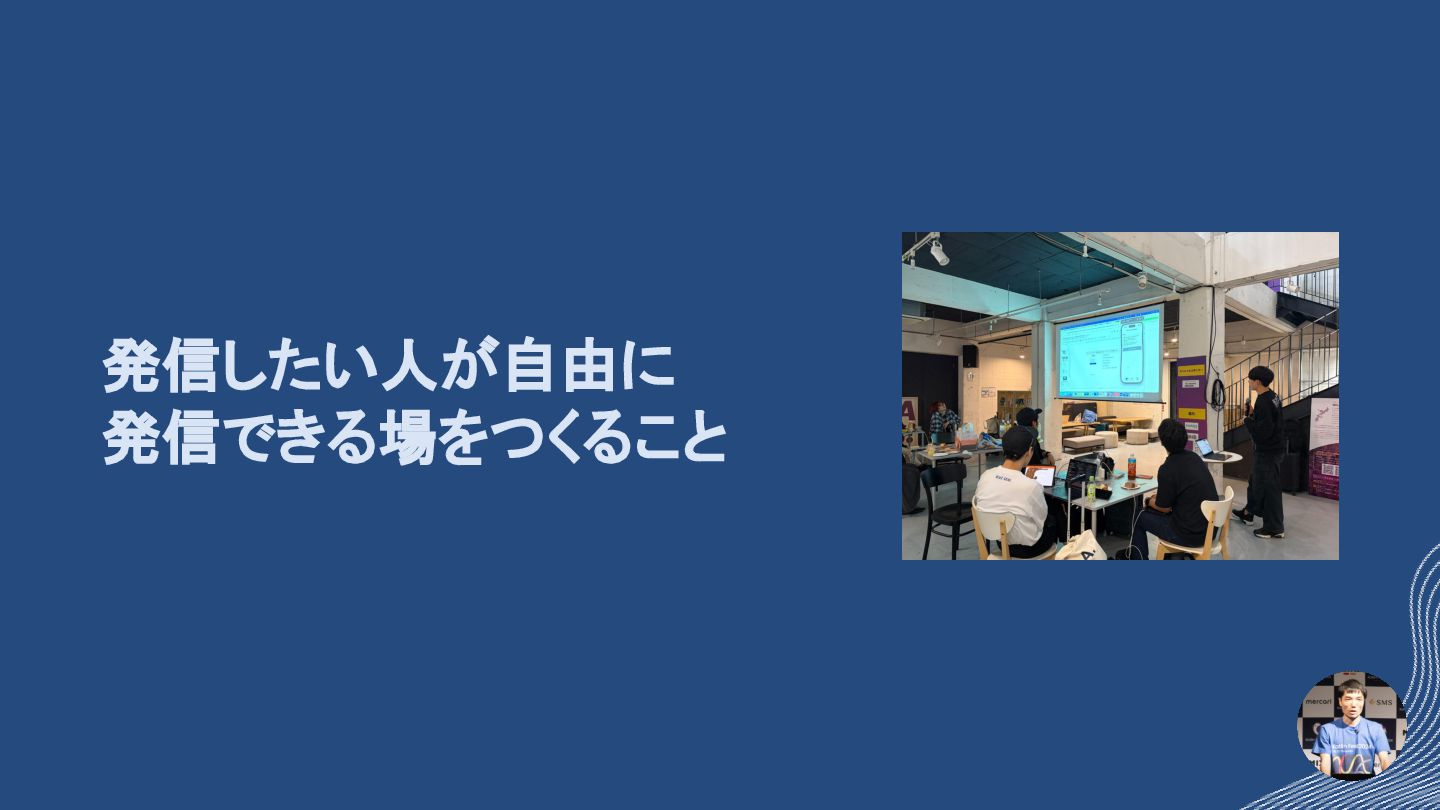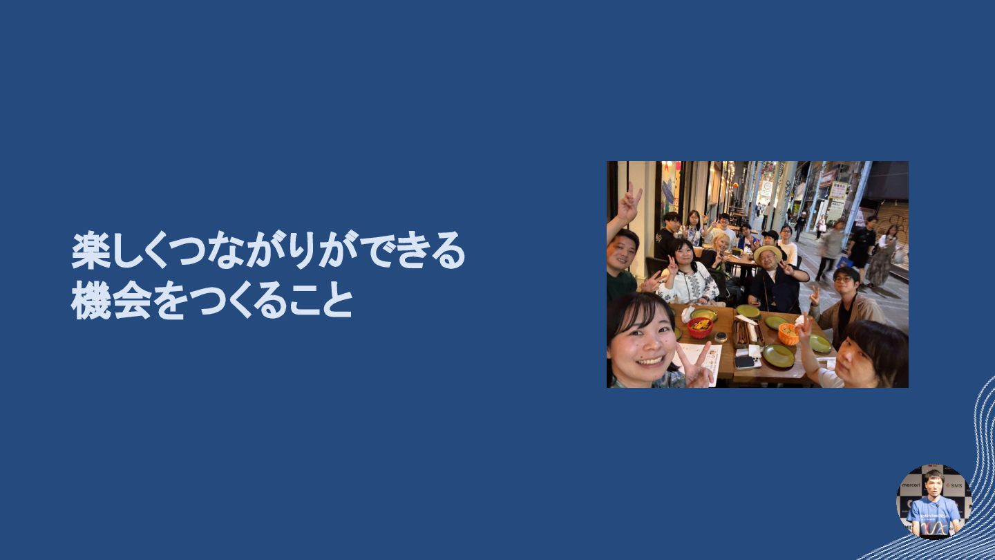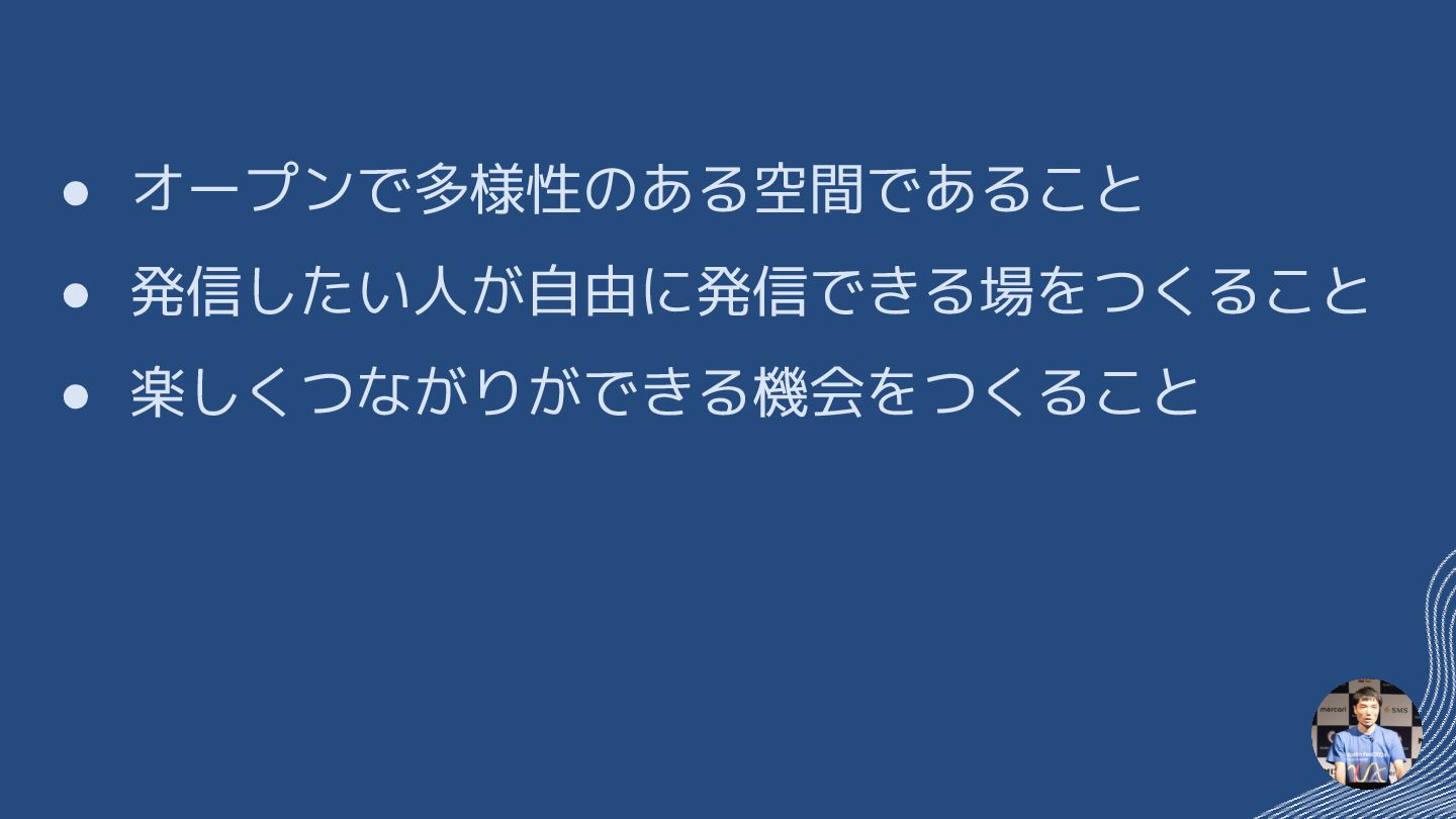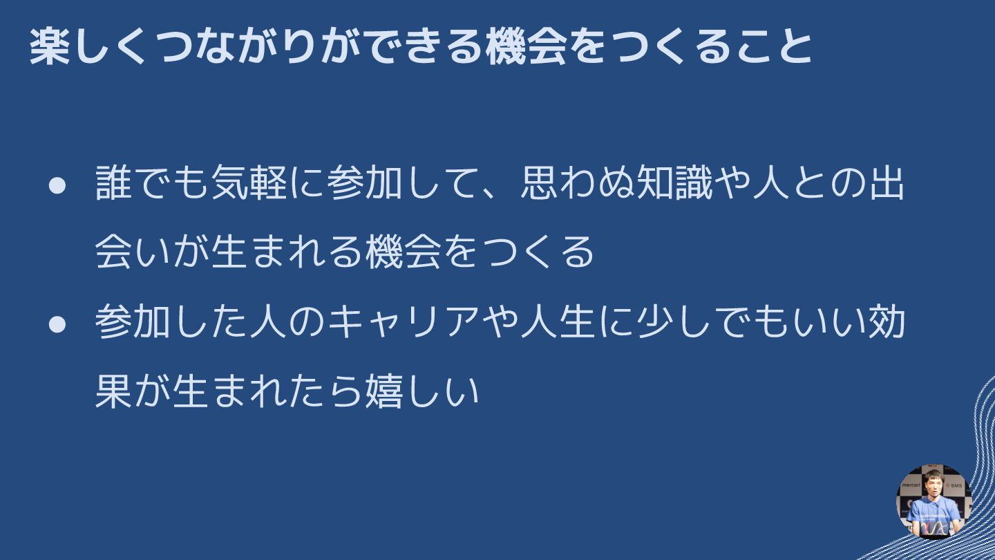 • 誰でも気軽に参加して、思わぬ知識や人との出 会いが生まれる機会をつくる • 参加した人のキャリアや人生に少しでもいい効 果が生まれたら嬉しい 楽しくつながりができる機会をつくること