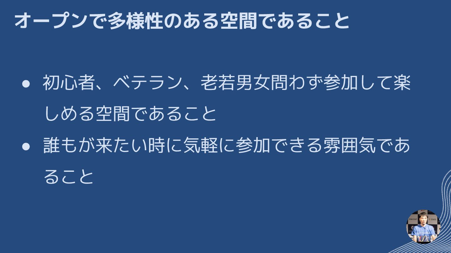 • 初心者、ベテラン、老若男女問わず参加して楽 しめる空間であること • 誰もが来たい時に気軽に参加できる雰囲気であ ること オープンで多様性のある空間であること