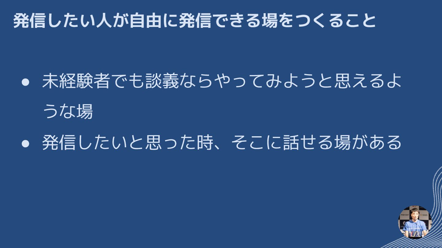 • 未経験者でも談義ならやってみようと思えるよ うな場 • 発信したいと思った時、そこに話せる場がある 発信したい人が自由に発信できる場をつくること