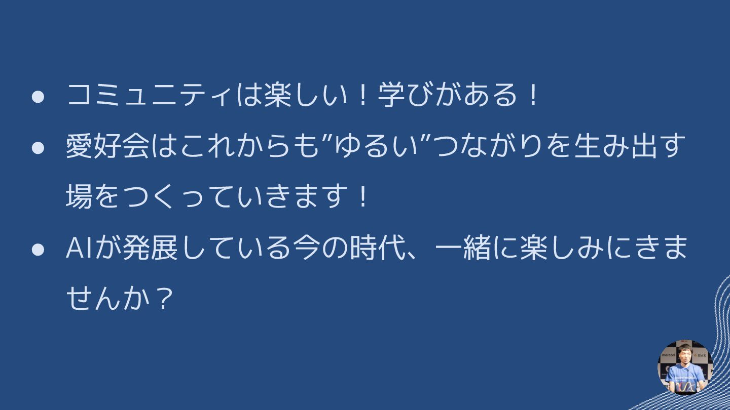• コミュニティは楽しい!学びがある! • 愛好会はこれからも”ゆるい”つながりを生み出す 場をつくっていきます! • AIが発展している今の時代、一緒に楽しみにきま せんか?