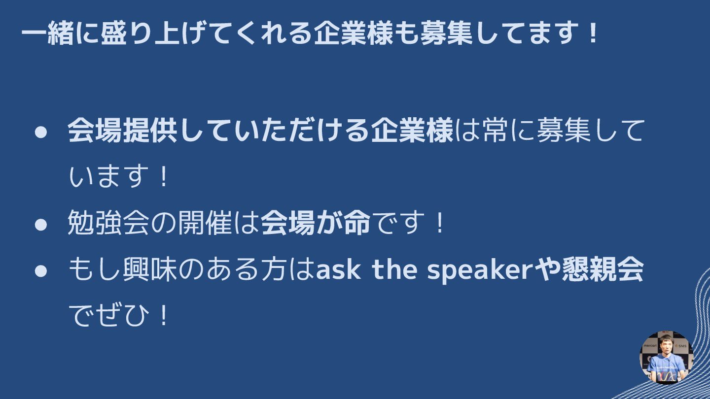 • 会場提供していただける企業様は常に募集して います! • 勉強会の開催は会場が命です! • もし興味のある方はask the speakerや懇親会 でぜひ!