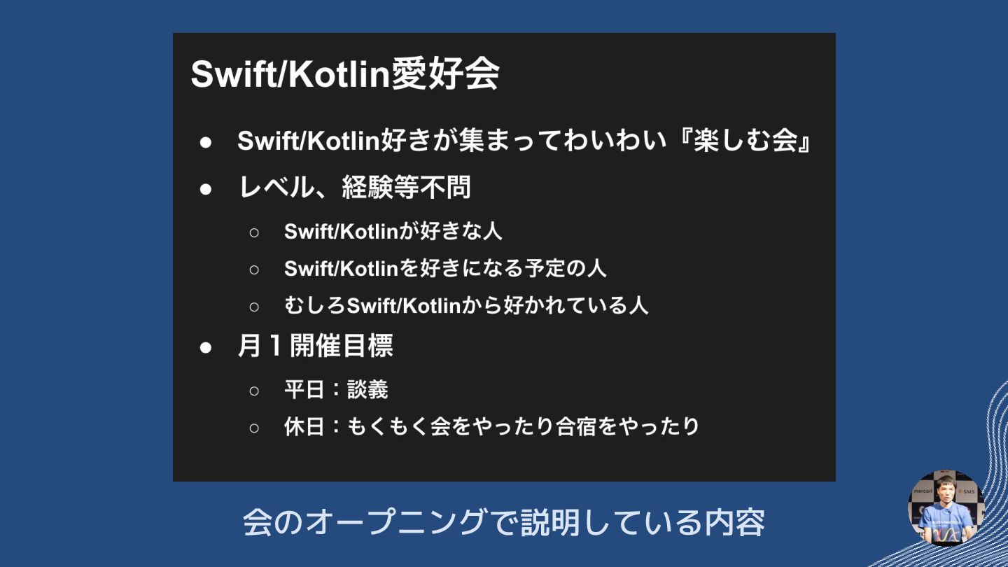 変遷 • 1年目:Swift愛好会が発足し、iOS界隈で浸透していく • 2年目:合宿や地方勉強会との合同開催など、毎月の通常開催以外の イベントもやり始める • 3年目:姉妹コミュニティのKotlin愛好会も始まる • 5年目:コロナ禍になり、オンライン開催や配信もするようになる
