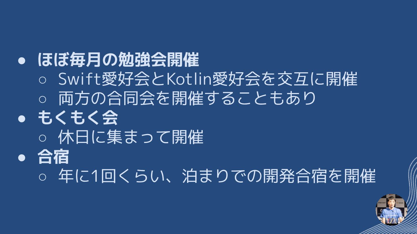 • ほぼ毎月の勉強会開催 ◦ Swift愛好会とKotlin愛好会を交互に開催 ◦ 両方の合同会を開催することもあり • もくもく会 ◦ 休日に集まって開催