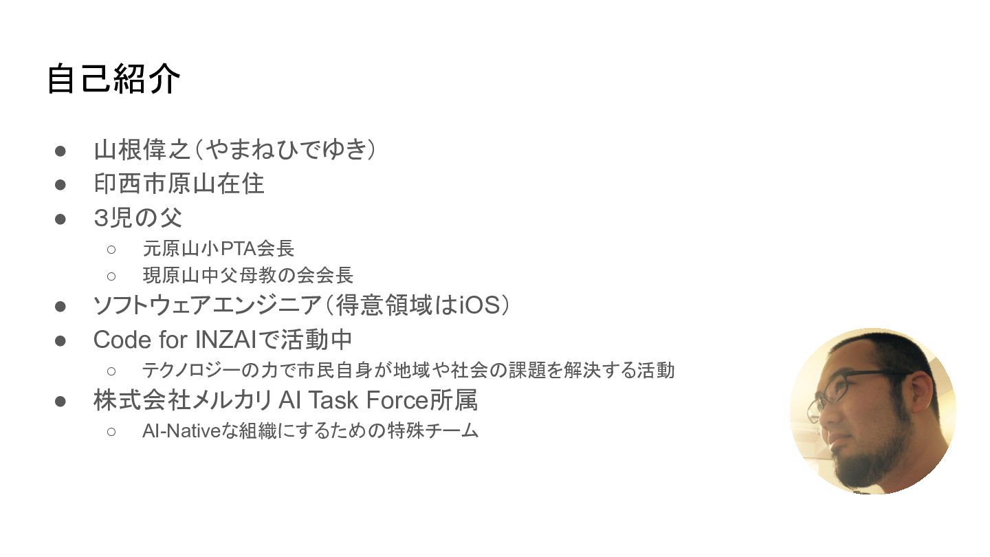 現原山中父母教の会会長 • ソフトウェアエンジニア(得意領域はiOS) • Code for INZAIで活動中 ◦ テクノロジーの力で市民自身が地域や社会の課題を解決する活動 • 株式会社メルカリ AI Task Force所属 ◦ AI-Nativeな組織にするための特殊チーム