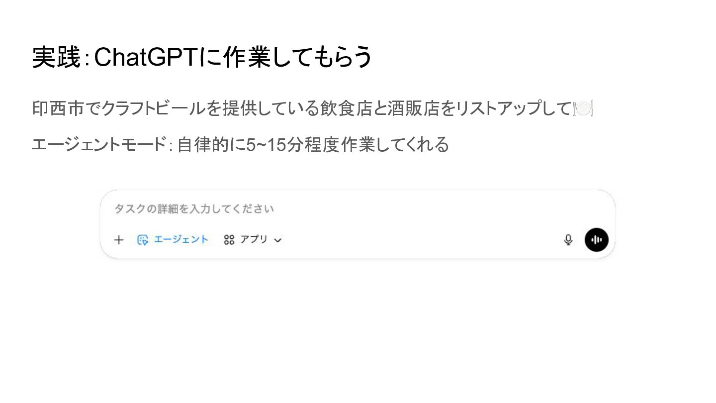 実践:ChatGPTに作業してもらう 印西市でクラフトビールを提供している飲食店と酒販店をリストアップして🍽 エージェントモード:自律的に5~15分程度作業してくれる