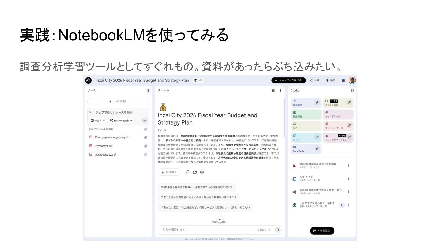 実践:NotebookLMを使ってみる 調査分析学習ツールとしてすぐれもの。資料があったらぶち込みたい。