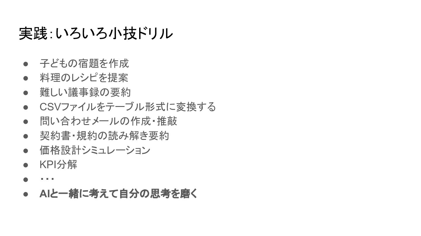 実践:いろいろ小技ドリル • 子どもの宿題を作成 • 料理のレシピを提案 • 難しい議事録の要約 • CSVファイルをテーブル形式に変換する •