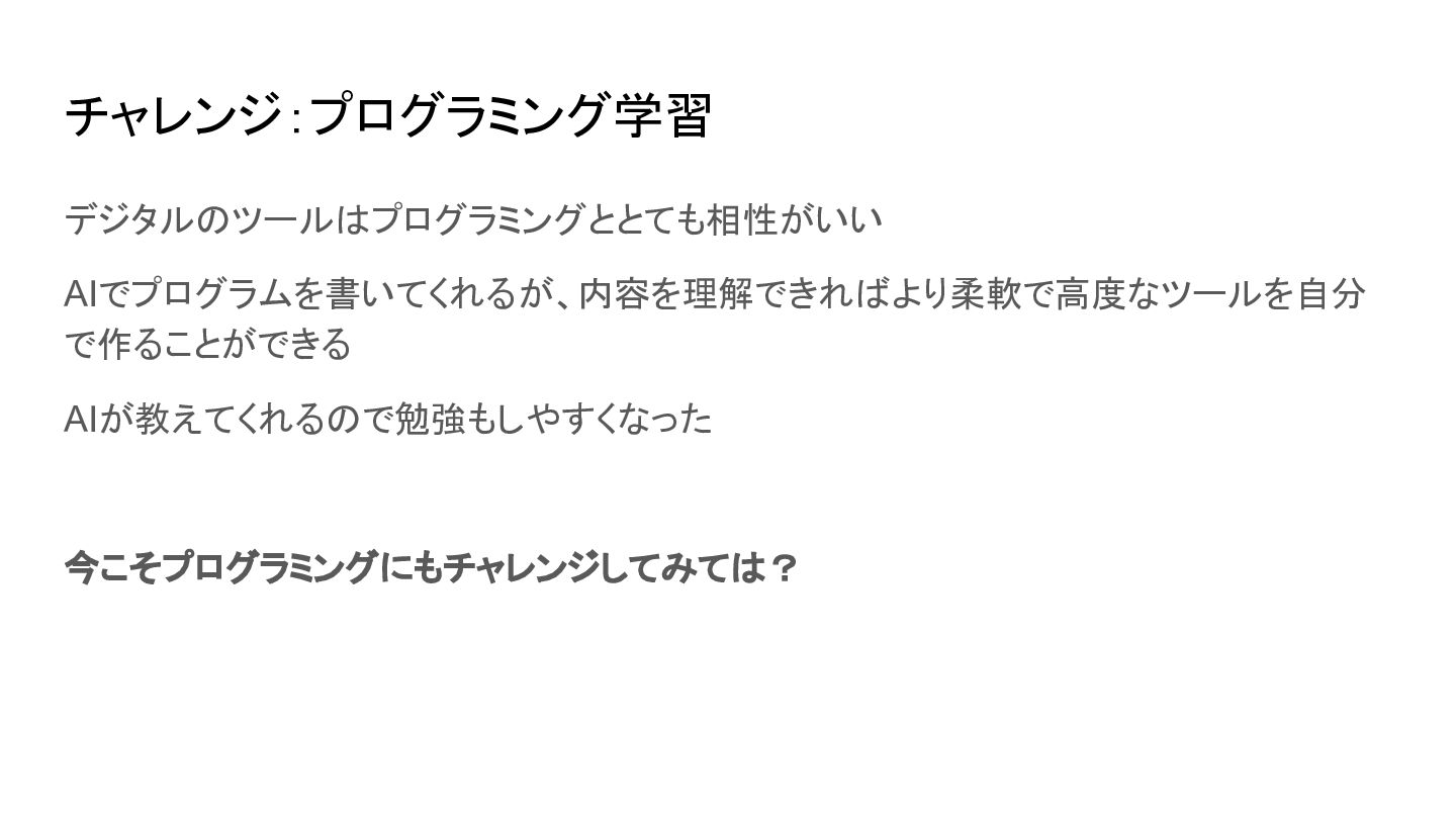 チャレンジ:プログラミング学習 デジタルのツールはプログラミングととても相性がいい AIでプログラムを書いてくれるが、内容を理解できればより柔軟で高度なツールを自分 で作ることができる AIが教えてくれるので勉強もしやすくなった 今こそプログラミングにもチャレンジしてみては?