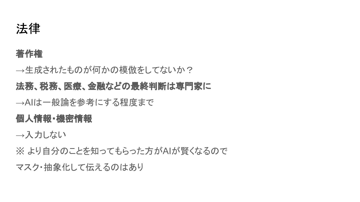 法律 著作権 →生成されたものが何かの模倣をしてないか? 法務、税務、医療、金融などの最終判断は専門家に →AIは一般論を参考にする程度まで 個人情報・機密情報 →入力しない ※ より自分のことを知ってもらった方がAIが賢くなるので マスク・抽象化して伝えるのはあり