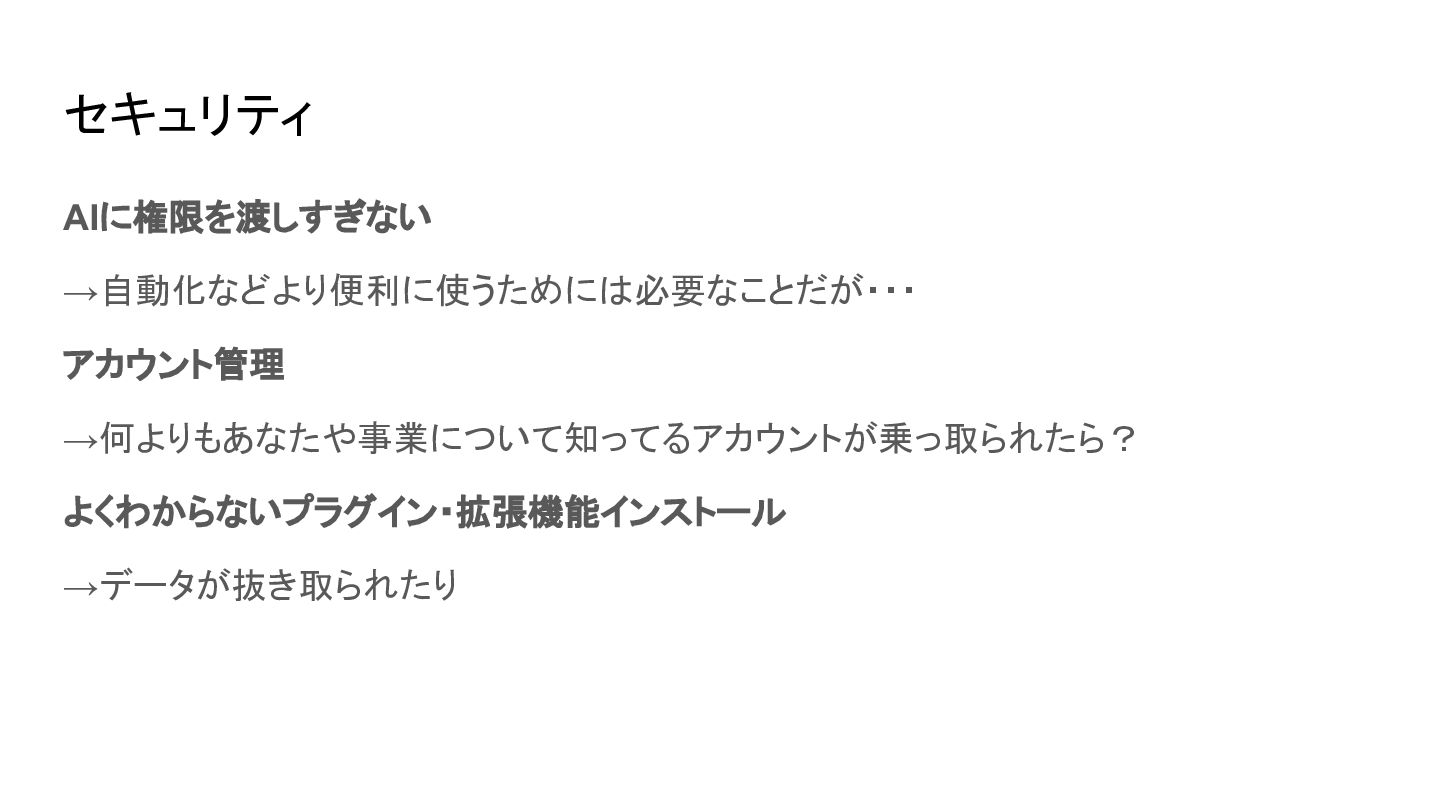 AIに権限を渡しすぎない →自動化などより便利に使うためには必要なことだが・・・ アカウント管理 →何よりもあなたや事業について知ってるアカウントが乗っ取られたら? よくわからないプラグイン・拡張機能インストール →データが抜き取られたり セキュリティ
