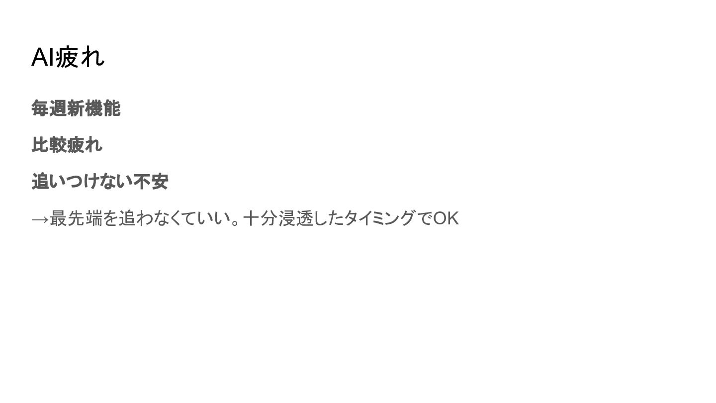 毎週新機能 比較疲れ 追いつけない不安 →最先端を追わなくていい。十分浸透したタイミングでOK AI疲れ