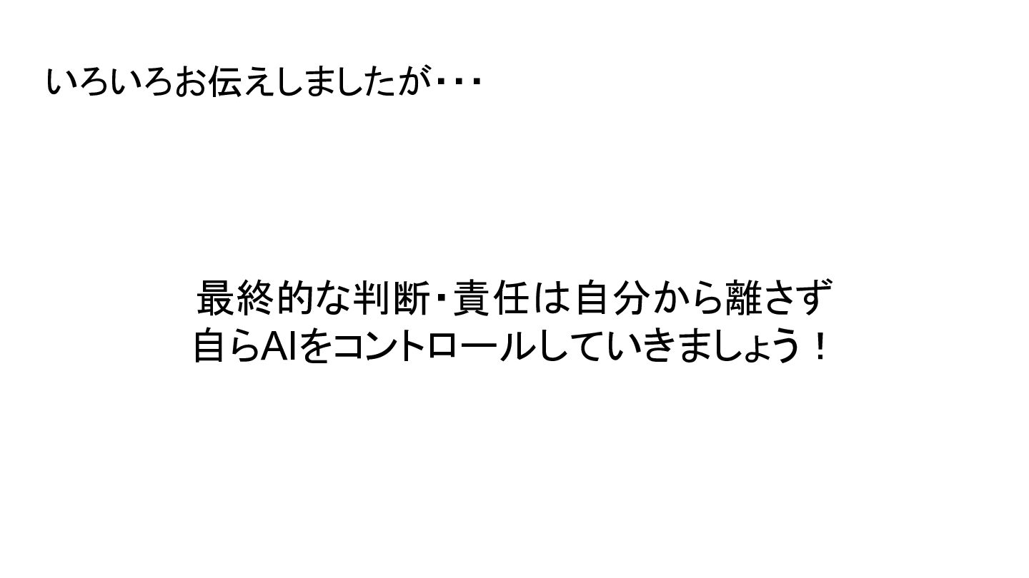 いろいろお伝えしましたが・・・ 最終的な判断・責任は自分から離さず 自らAIをコントロールしていきましょう!