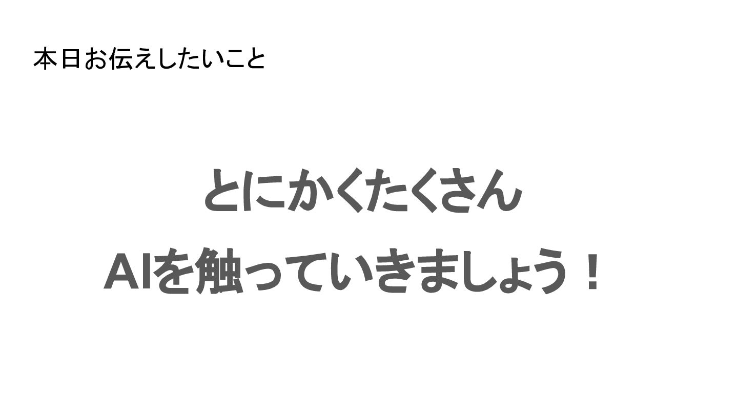 本日お伝えしたいこと とにかくたくさん AIを触っていきましょう!
