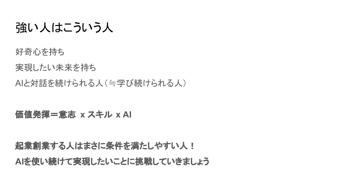 強い人はこういう人 好奇心を持ち 実現したい未来を持ち AIと対話を続けられる人(≒学び続けられる人) 価値発揮=意志 x スキル x AI 起業創業する人はまさに条件を満たしやすい人!