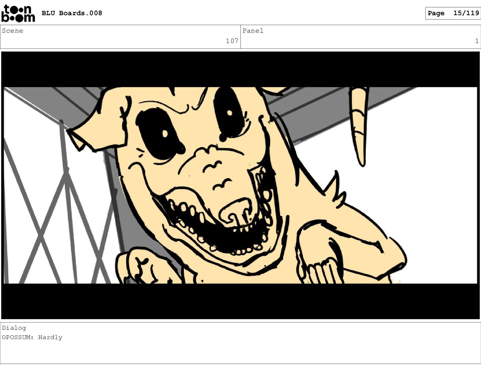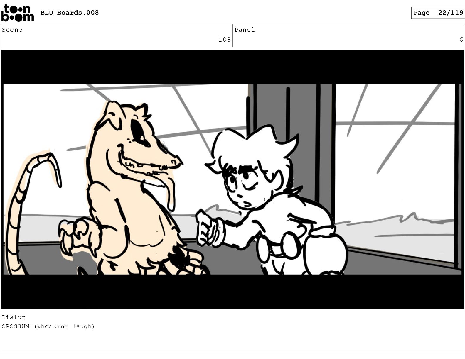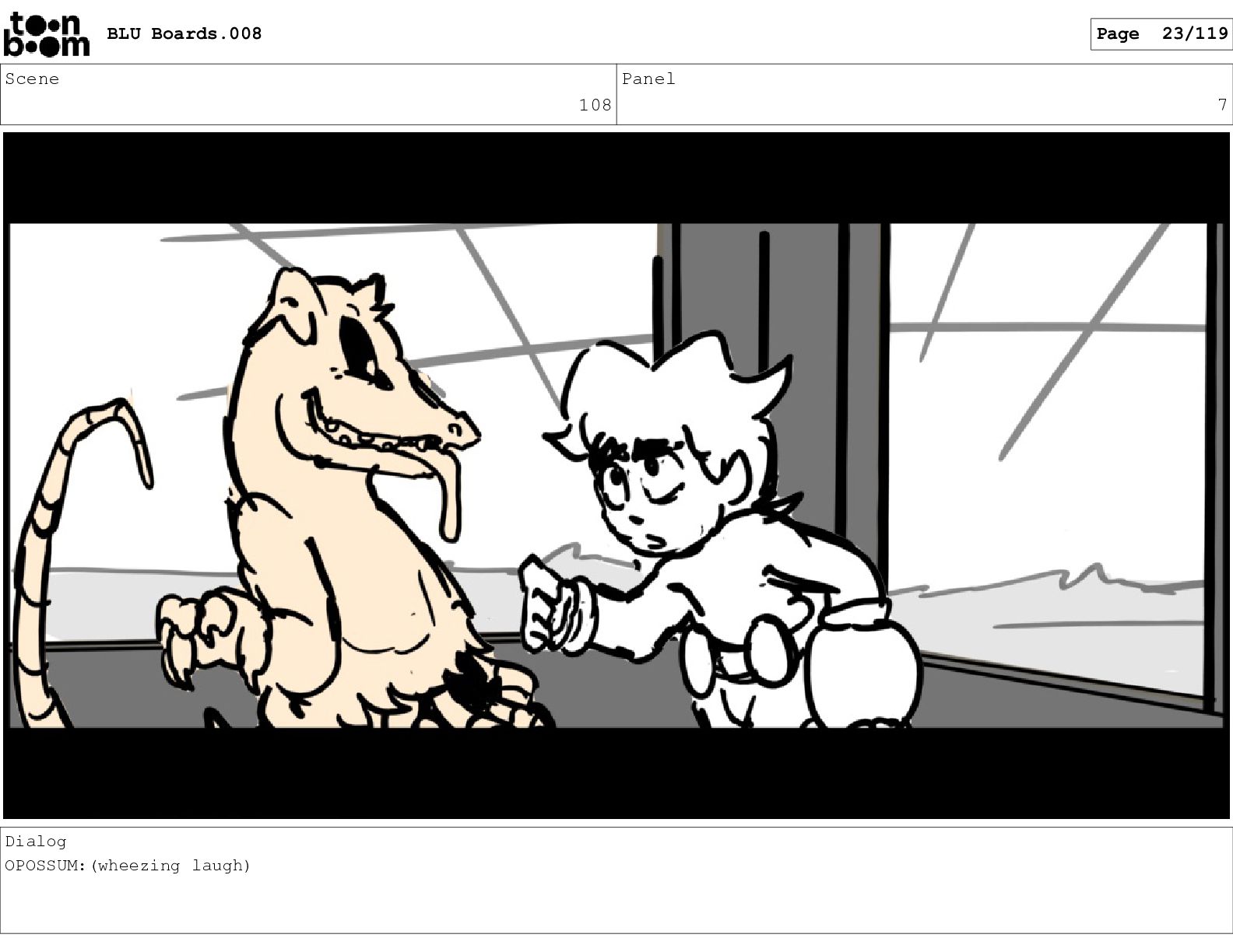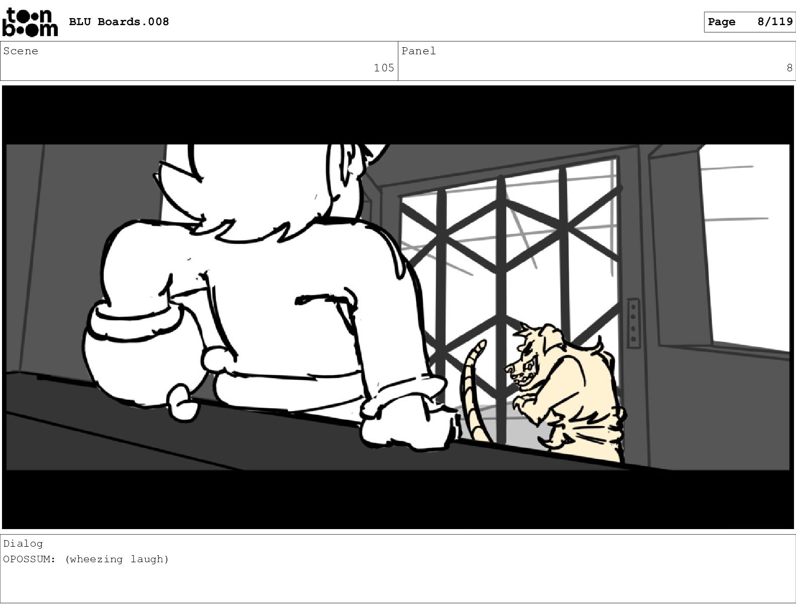 Scene 105 Panel 8 Dialog OPOSSUM: (wheezing laugh) BLU Boards.008