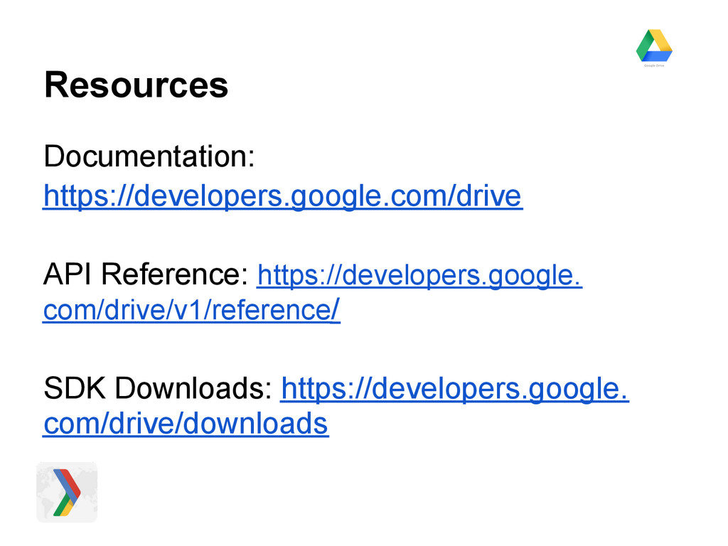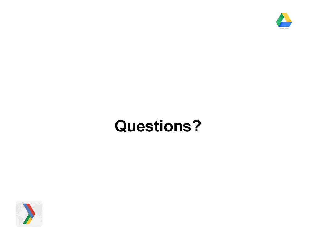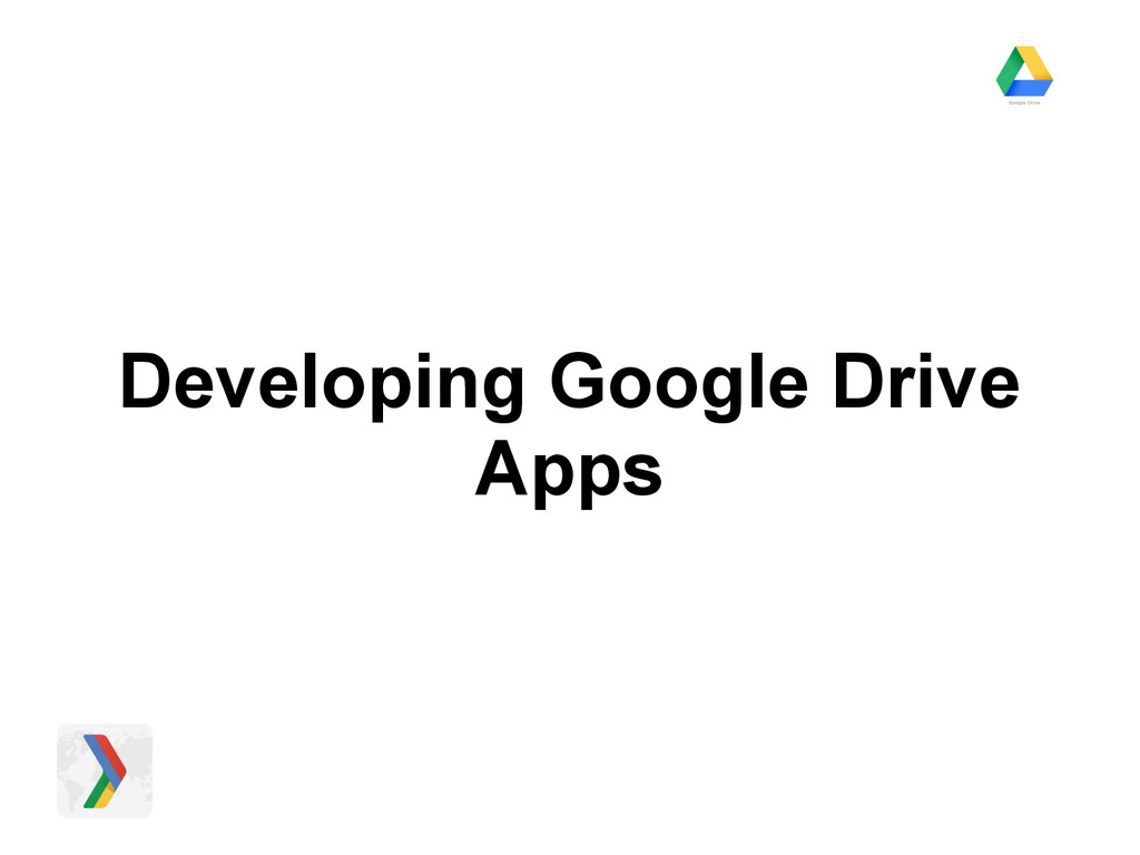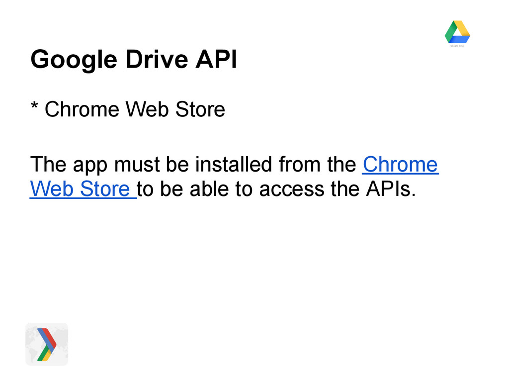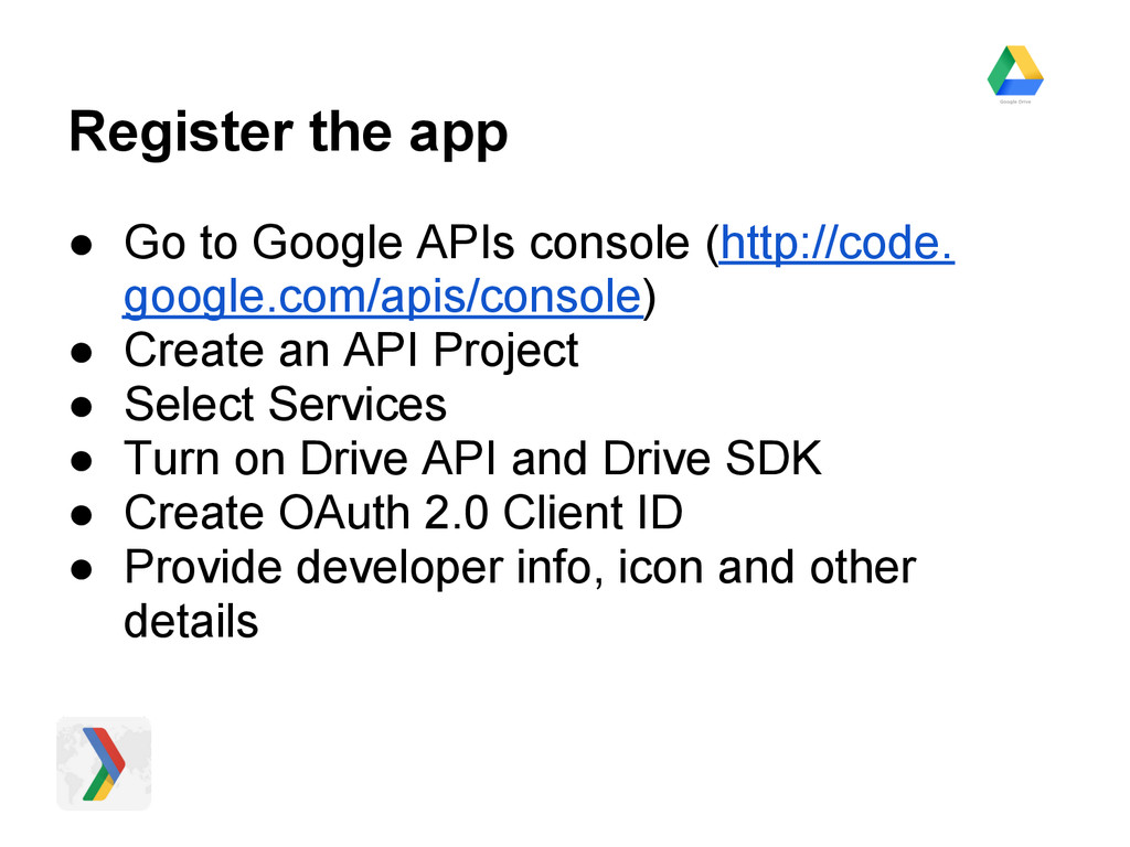 an API Project • Select Services • Turn on Drive API and Drive SDK • Create OAuth 2.0 Client ID • Provide developer info, icon and other details Register the app