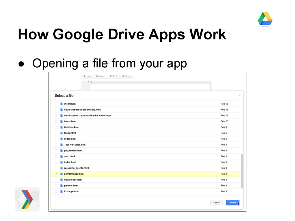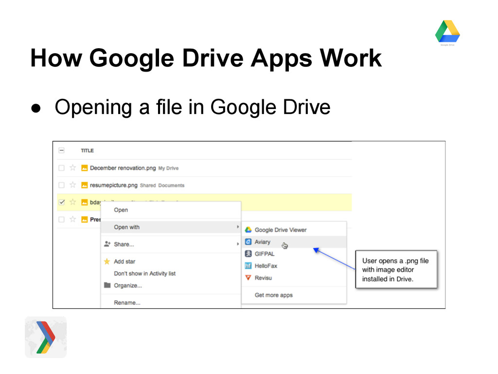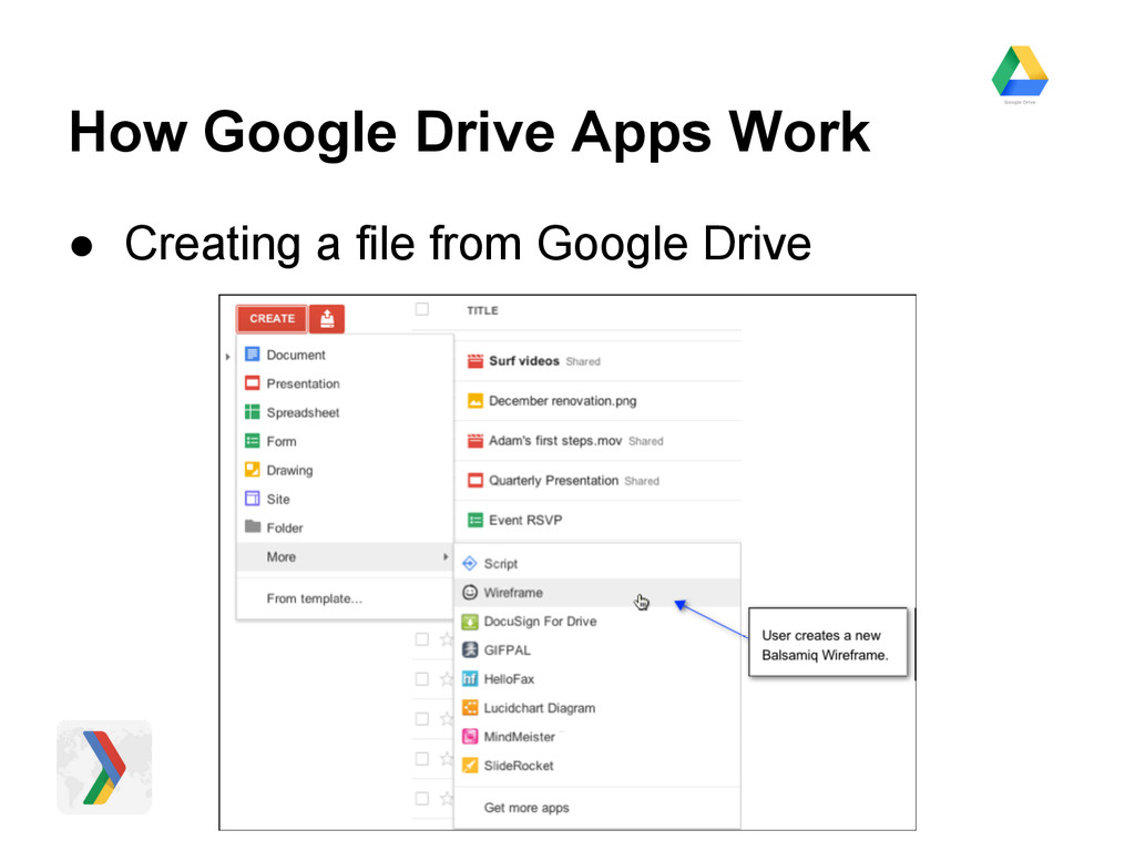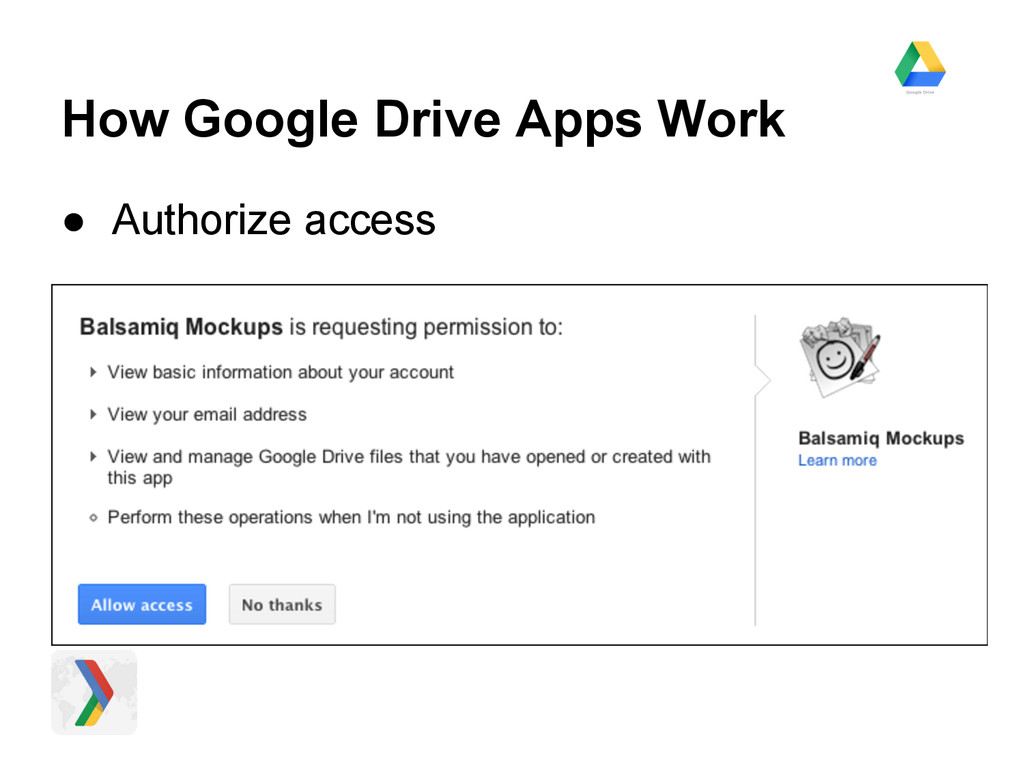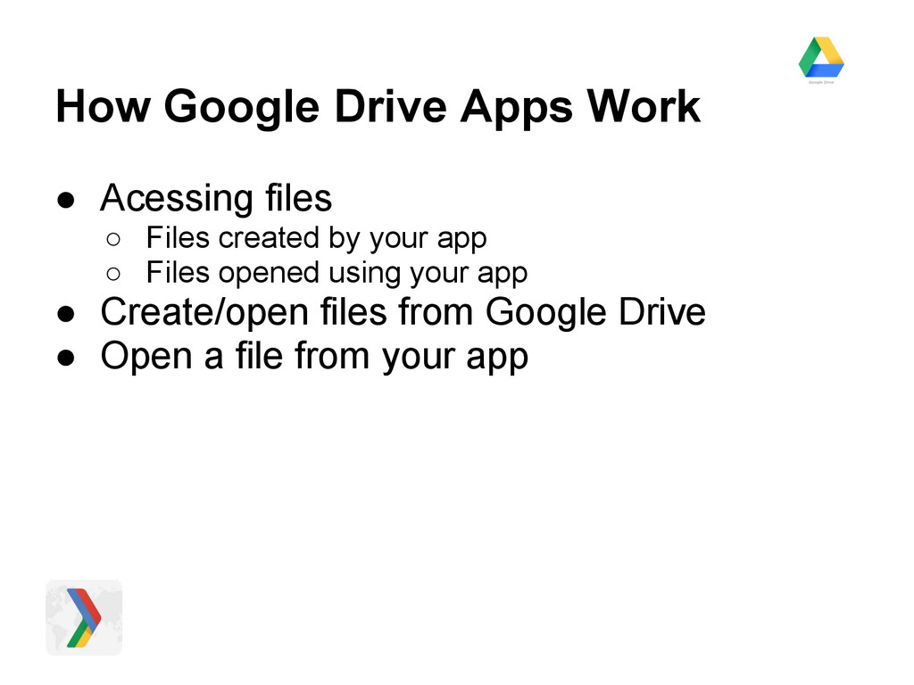 an API Project • Select Services • Turn on Drive API and Drive SDK • Create OAuth 2.0 Client ID • Provide developer info, icon and other details Register the app
