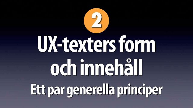 om ”order komplett” eller ”betalning under behandling” • Skriv i bestämd form: ”koden är godkänd” hellre än ”kod godkänd”. • Och givetvis ska ux-texter vara på svenska och i klartext. De ska aldrig bara visa teknisk information eller koder (”Error XWZS1323”).