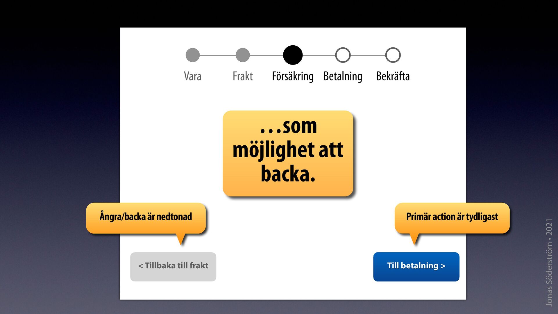 läge systemet är • Ge användaren maximal kontroll • Automatisera repetitiva eller enkla uppgifter – minska belastning • Gör det svårt / omöjligt att göra fel • Gör det enkelt / möjligt att ångra eller rätta • Använd mikrofriktioner för att motverka ”slarvfel” • Respektera/använd närhetens lag och likhetens lag • Medge fl er sätt att interagera • Sträva efter k onsistens och använd standards