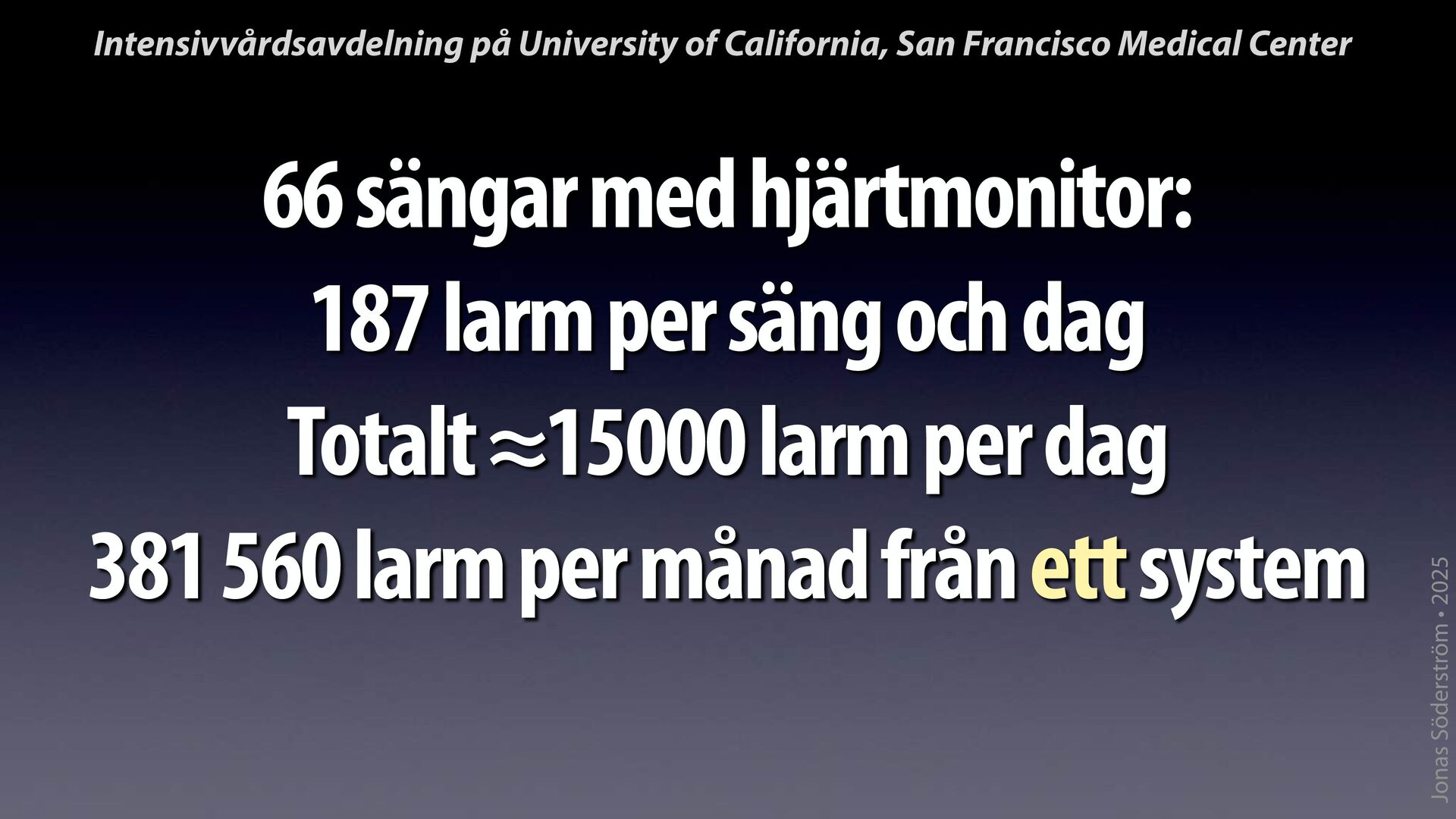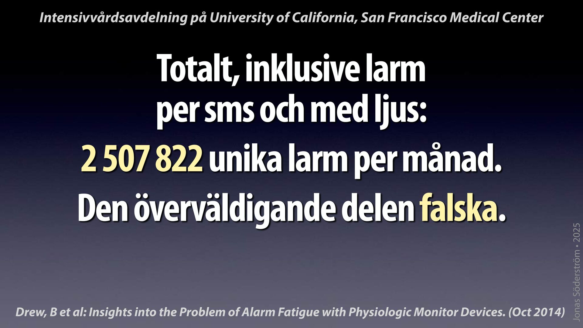 med ljus: 2 507 822 unika larm per månad. Den överväldigande delen falska. Drew, B et al: Insights into the Problem of Alarm Fatigue with Physiologic Monitor Devices. (Oct 2014) Intensivvårdsavdelning på University of California, San Francisco Medical Center