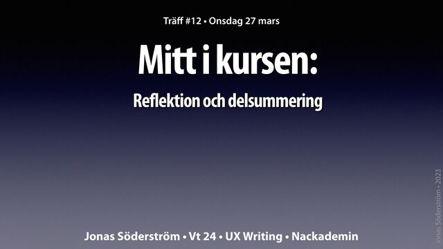 april Ton, avsändarpersonor, framing. Tr ä ff #14. Ons 10 april Klarspråk och krångligt språk 2. Tr ä ff #15. Ons 17 april Genomgång uppgift 2. Tr ä ff #16. Ons 24 april Skriva för e ff ekt. Målgrupper inom UX. Tr ä ff #17. Mån 29 april L ä nkar. Bild på webb. Tr ä ff #18. Ons 8 maj UX Research. Tr ä ff #19. Ons 15 maj Typogra fi . Textdesign. Tr ä ff #20. Ons 22 maj Interaktionsdesign. UX-process. Tr ä ff #21. Ons 29 maj SEO. Testa text. Tr ä ff #22. Ons 5 juni Genomgång av uppgift 3. Tr ä ff #23. Ons 12 juni Reserv / AMA med Jonas. Tr ä ff #24. Ons 19 juni Avslutning.