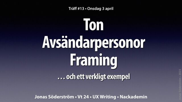 Träff #13 • Ton avsändarpersonor framing • Ons 3 april • vt 24 • UX Writing • Nackademin