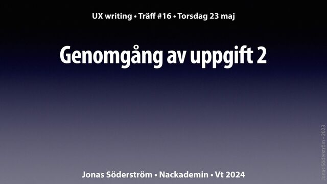 Träff #16 • Genomgång uppgift 2 • Tors 23 maj • vt 24 UX Writing • Nackademin