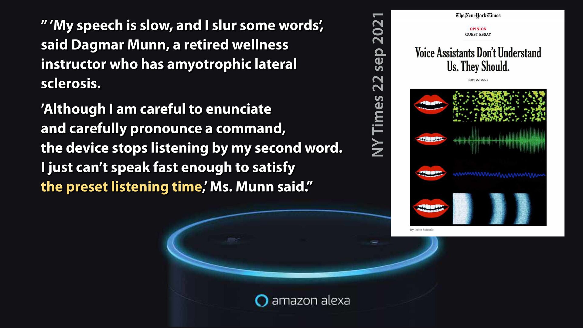 to cater to uninterrupted speech from “the average North American English voice,” said Frank Rudzicz, associate professor at the University of Toronto who studies speech, language and arti fi cial intelligence. As a result, diverse speech patterns sometimes sound foreign to voice-enabled devices. In other words, companies have rarely prioritized those of us whose speech doesn’t match what engineers assume to be the norm. https://www.nytimes.com/2021/09/22/opinion/voice-assistants-accessibility-disability.html