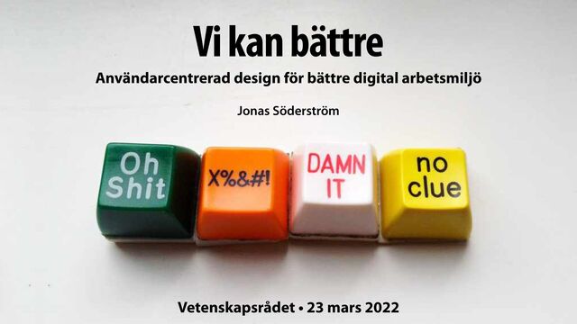 printern krånglar, långsamt nätverk, långa väntetider, uppdateringar som stör arbetet Dålig användbarhet: orimligt många klick, svårt att hitta, lätt att göra fel, svag feedback, dålig utbildning Tids- och motivationstjuvar: detaljstyrning, betungande administration, nedskärningar, brist på flexibilitet, stödjer inte verkliga uppgifter Anpassat till människor & uppgift Inverkan på själva arbetet Teknisk kvalitet: stabilitet, kapacitet