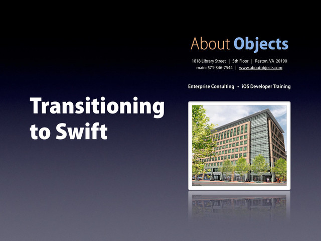 speaker. • 20+ years Objective-C and Java, including 7 years on iOS. 1818 Library Street | 5th Floor | Reston, VA 20190 main: 571-346-7544 | www.aboutobjects.com iOS Developer Training • Enterprise iOS Development